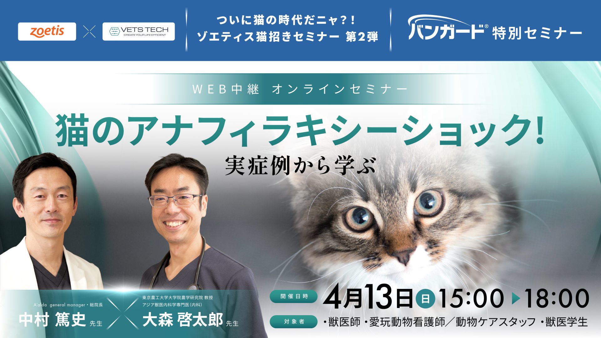 今年はゾエティス猫招きセミナー第2弾も兼ねて、中村篤史先生と大森啓太郎先生を講師にお招きして猫のアナフィラキシーショックをテーマにお届けいたします!